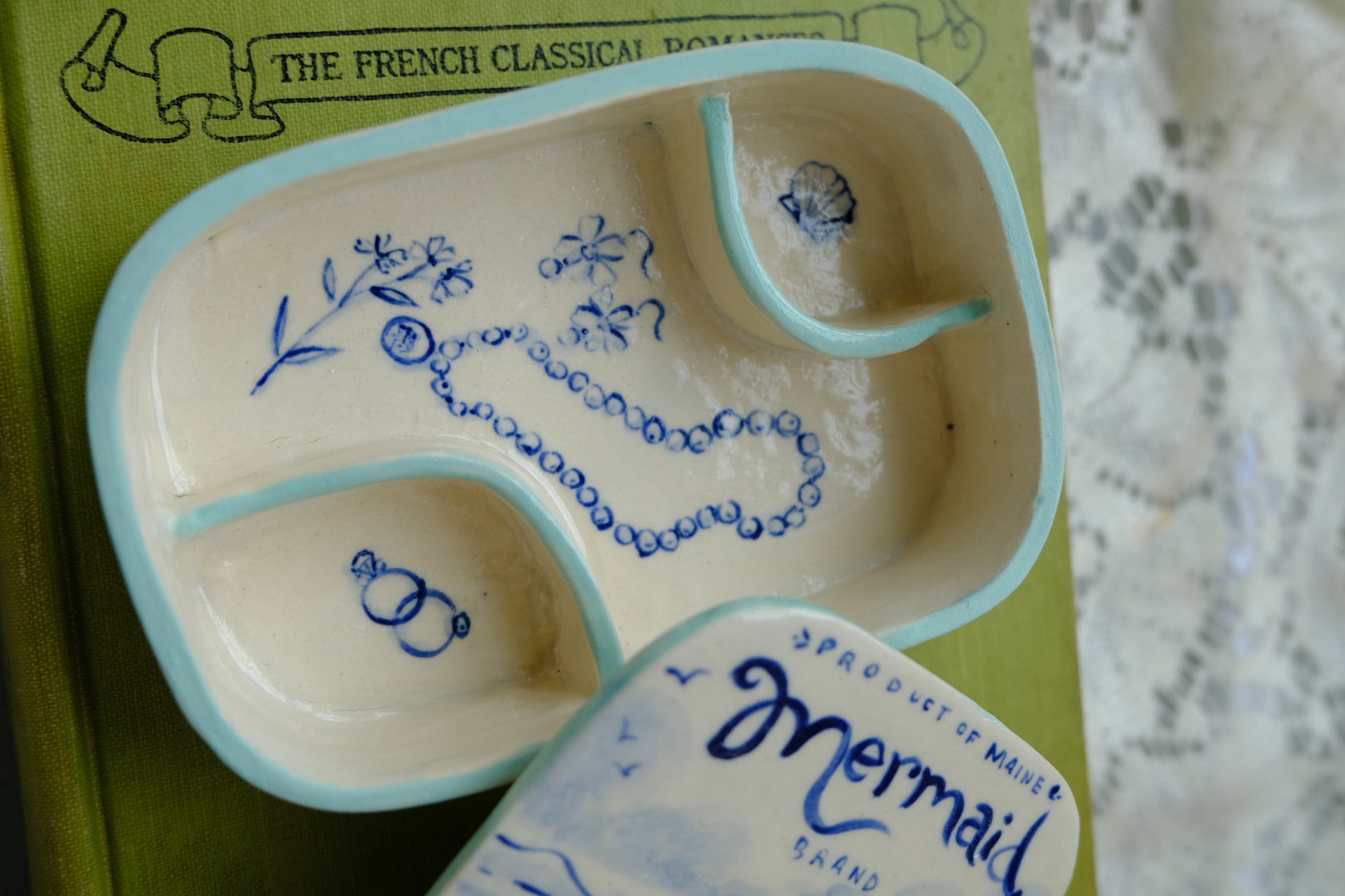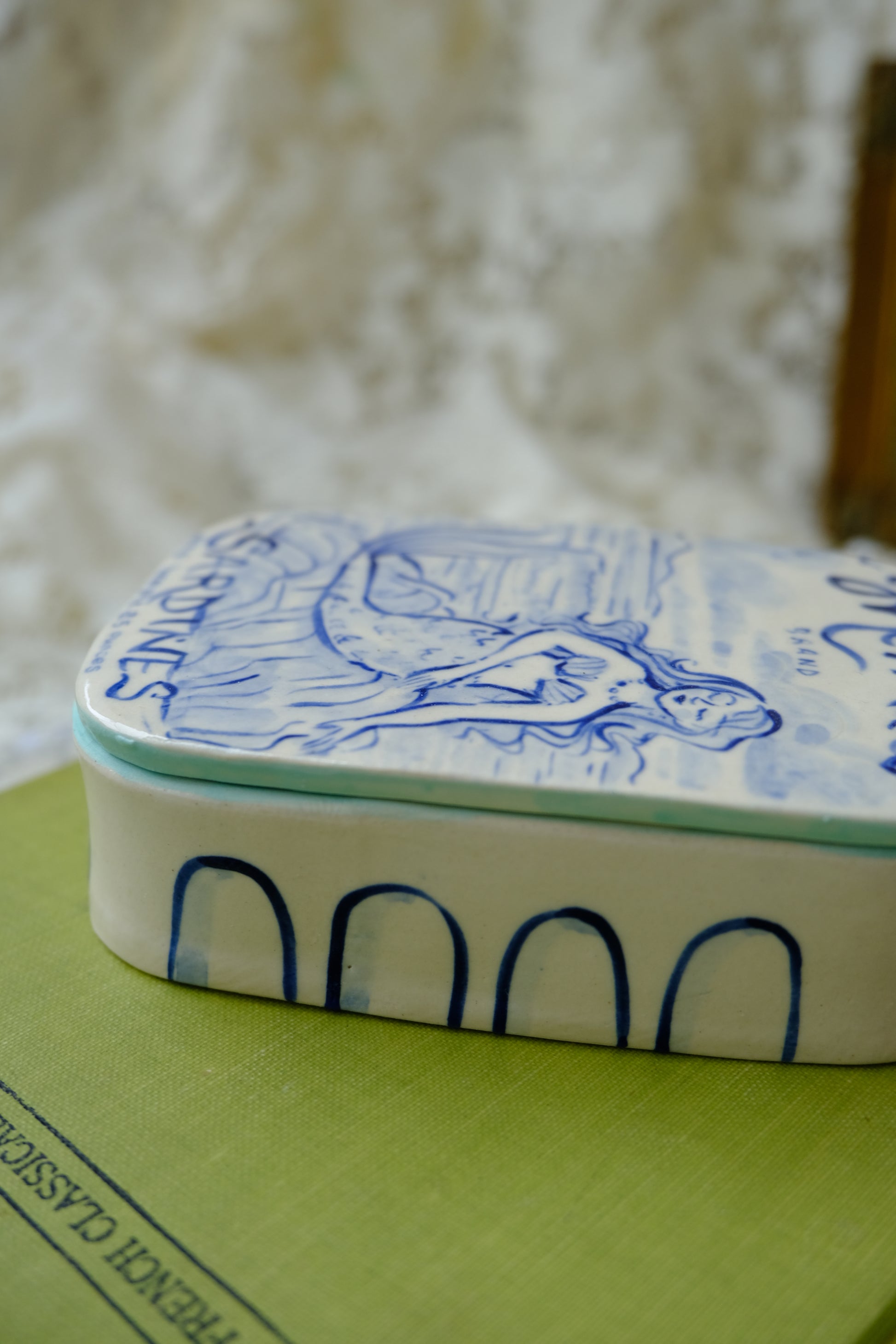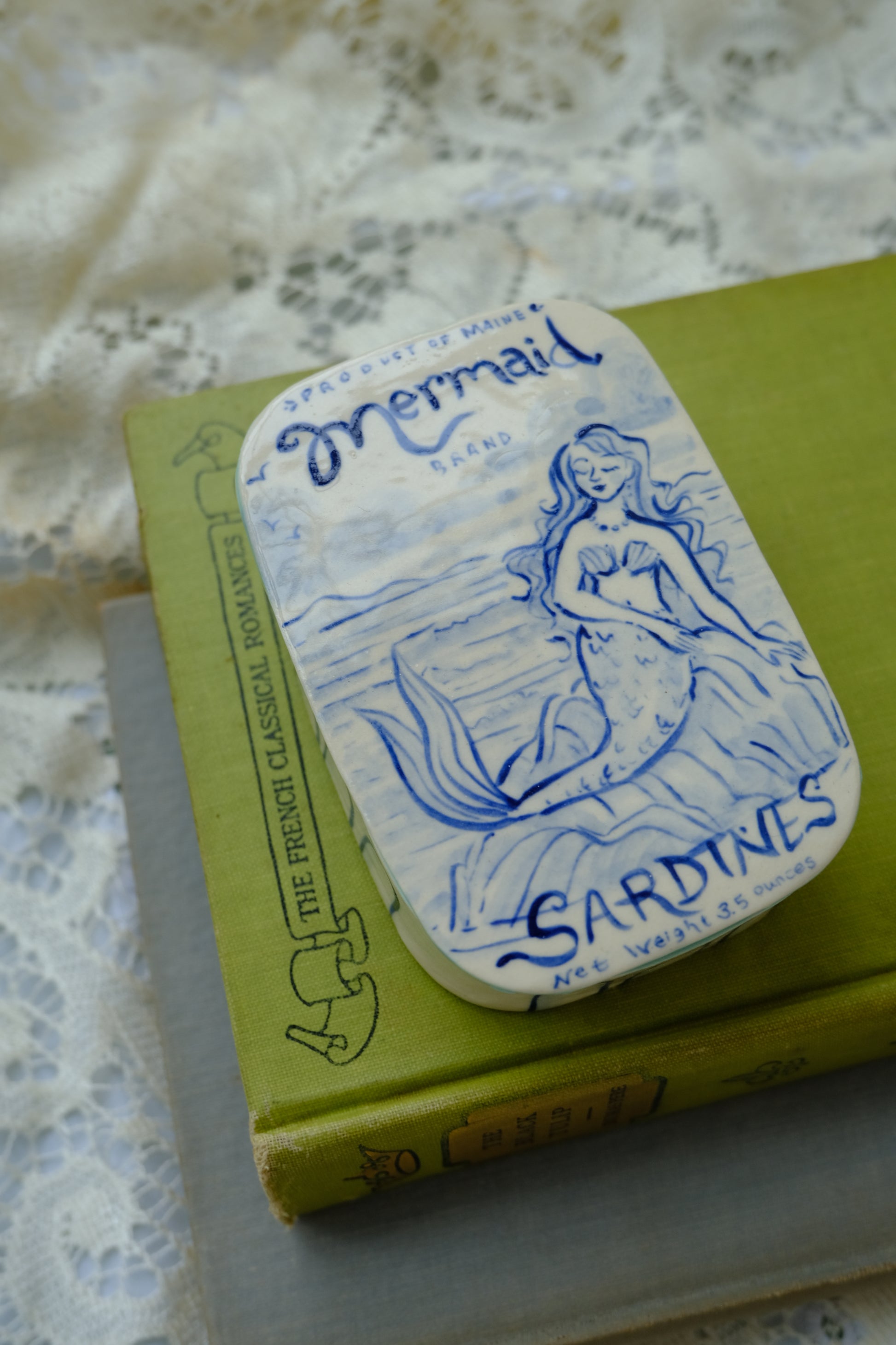 The famous sardine jewelry box! Featuring sweet hand-painted detailing on all sides and little pockets for your treasures. Hand made with love using white ceramic stoneware.