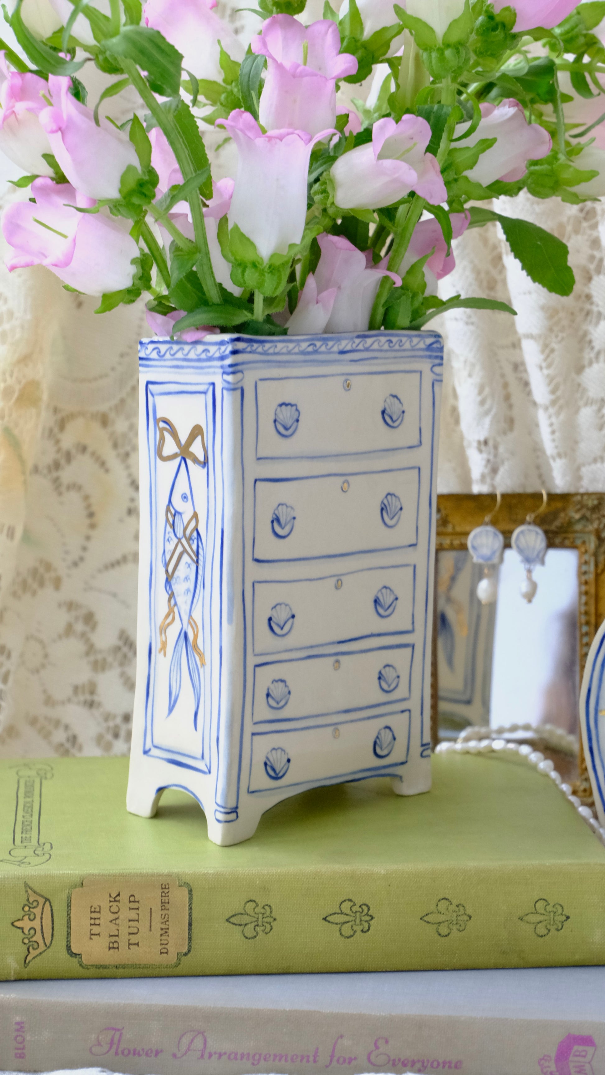 Hand painted and sculpted with white ceramic stoneware and gold luster detail. This vase is one of a kind!