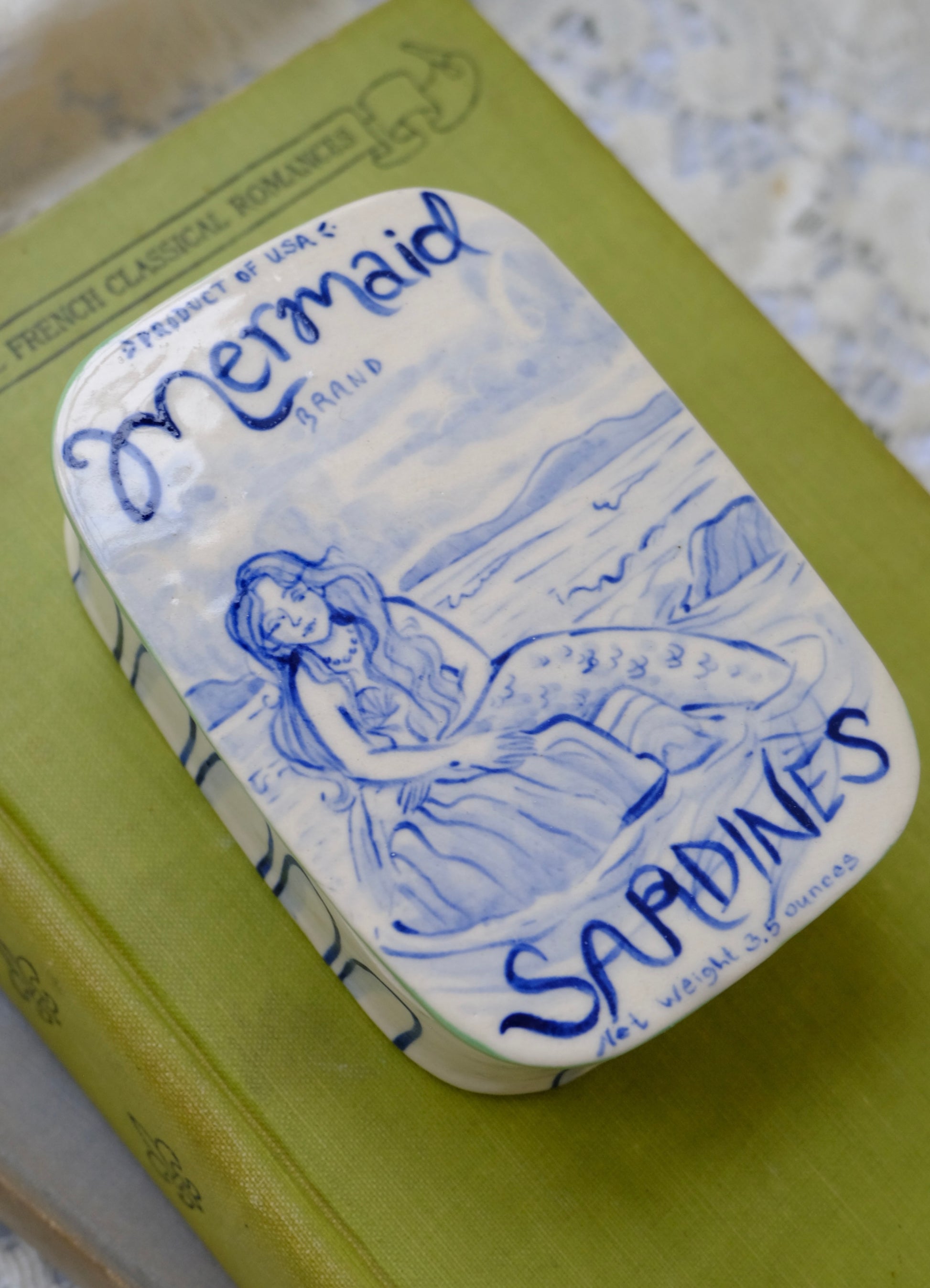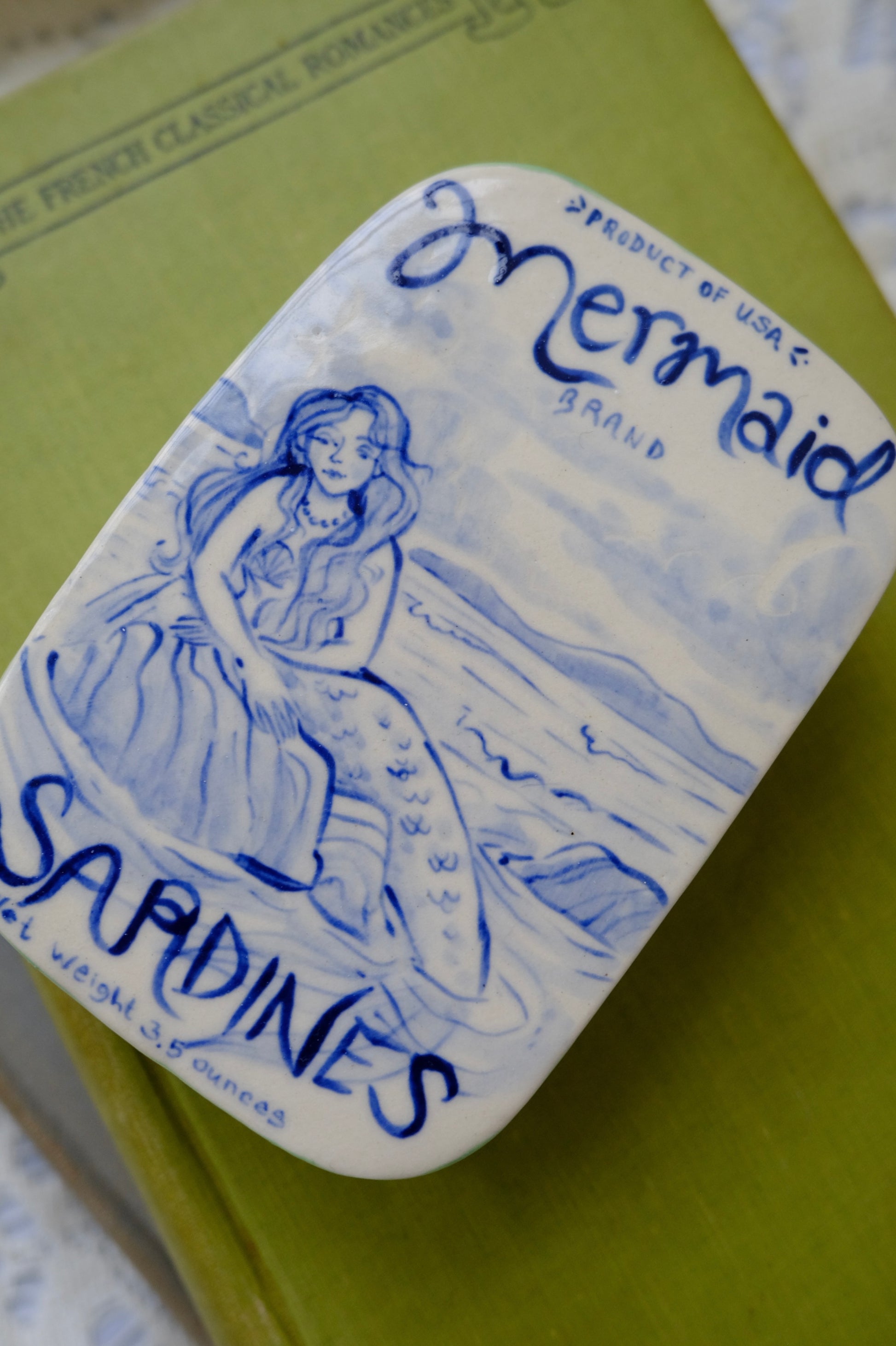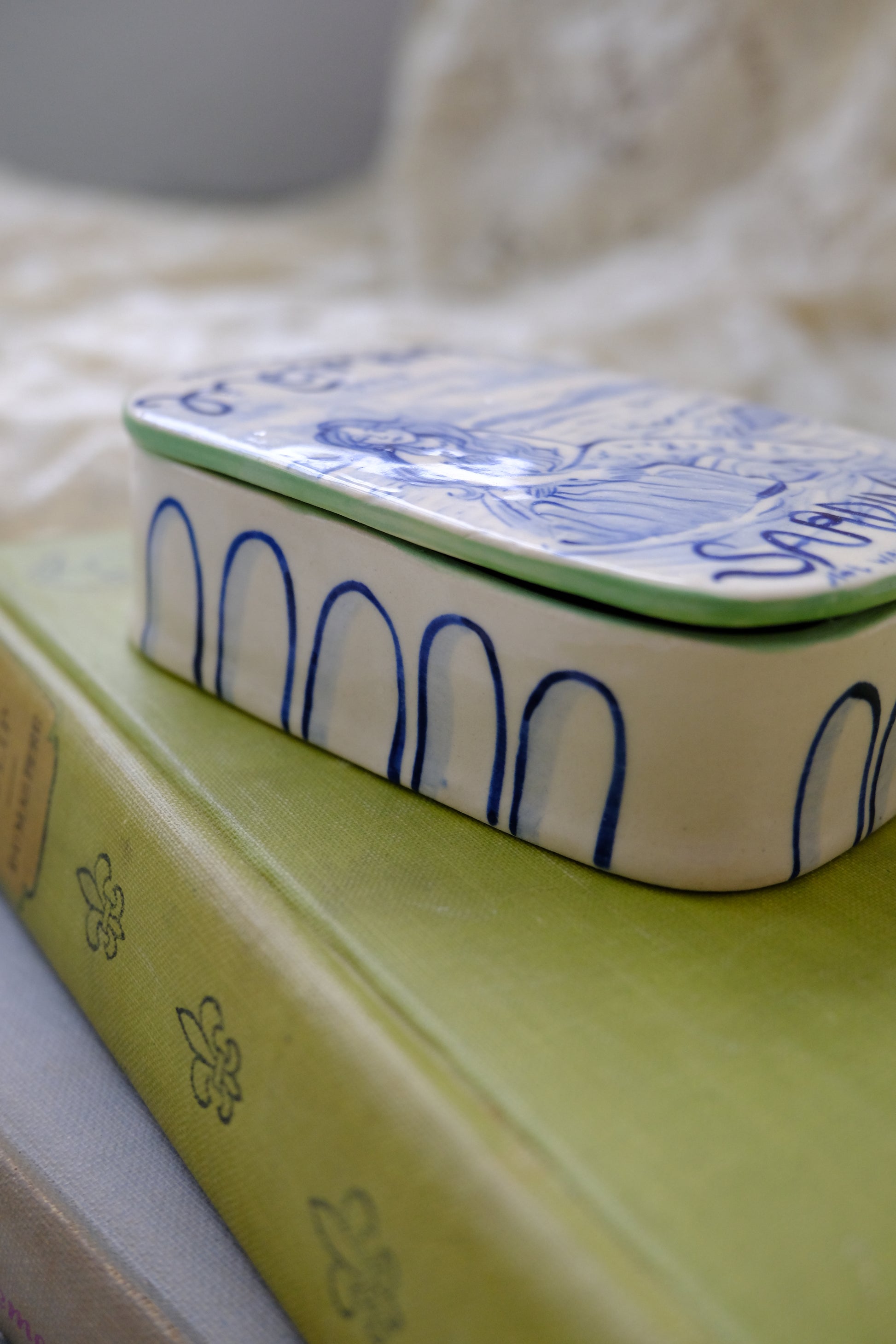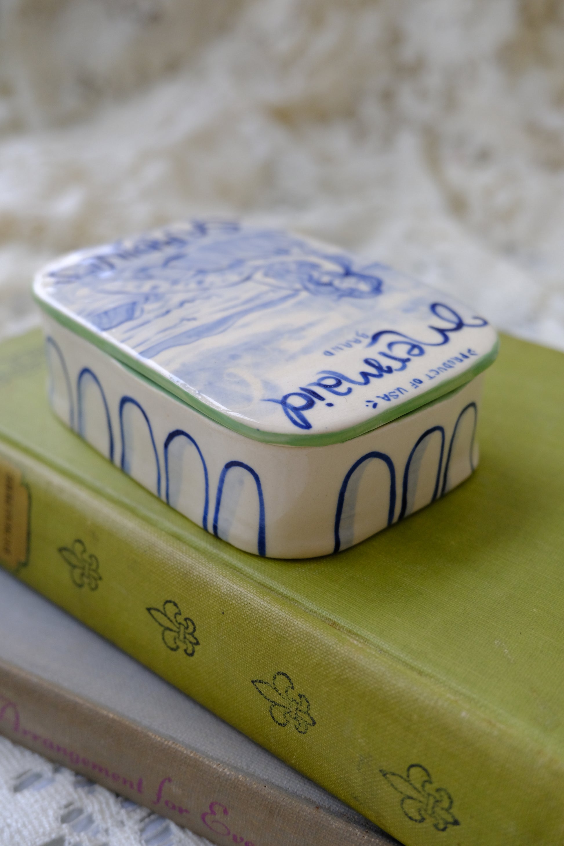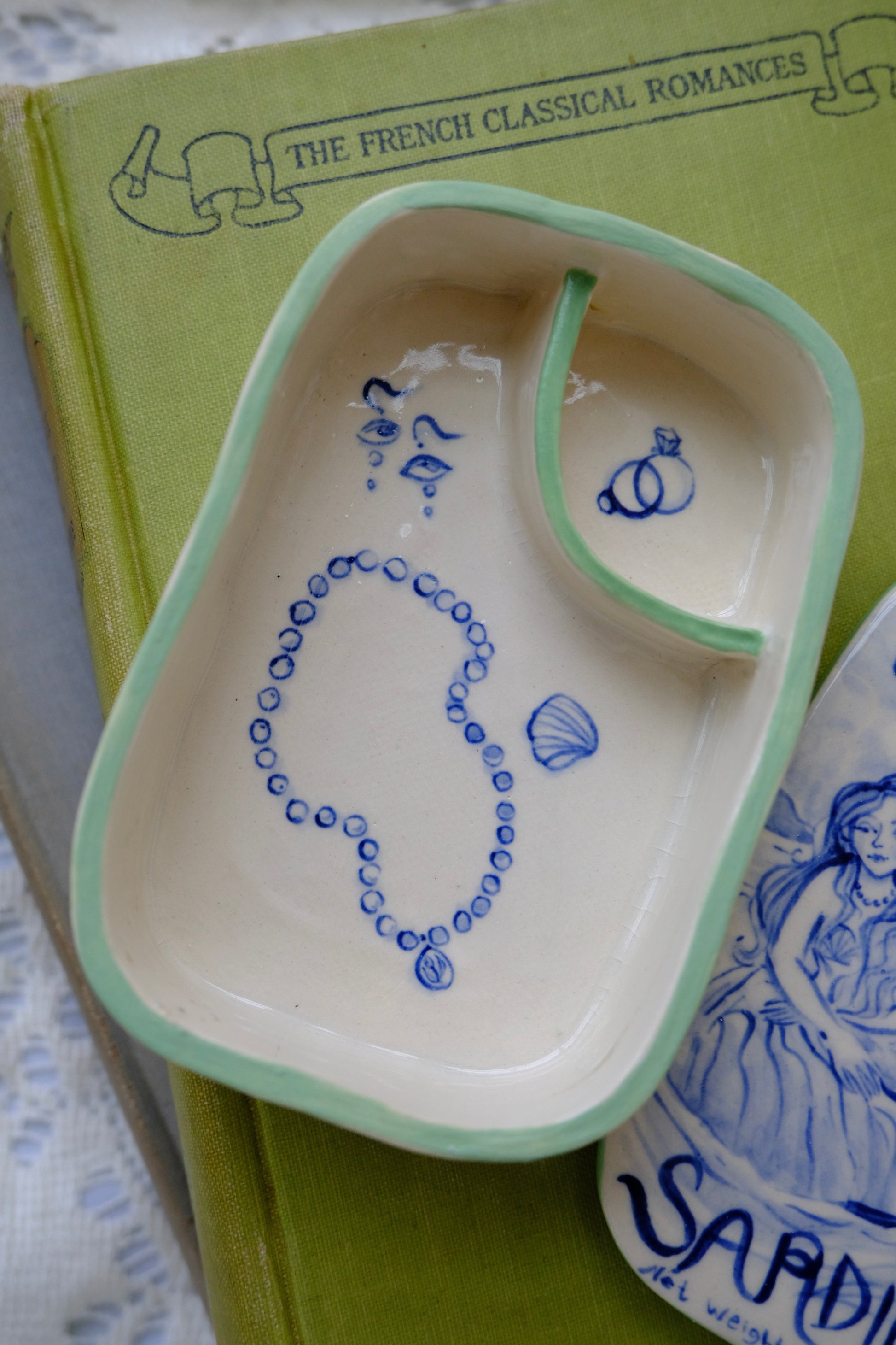 The famous sardine jewelry box! Featuring sweet hand-painted detailing on all sides and little pockets for your treasures. Hand made with love using white ceramic stoneware.