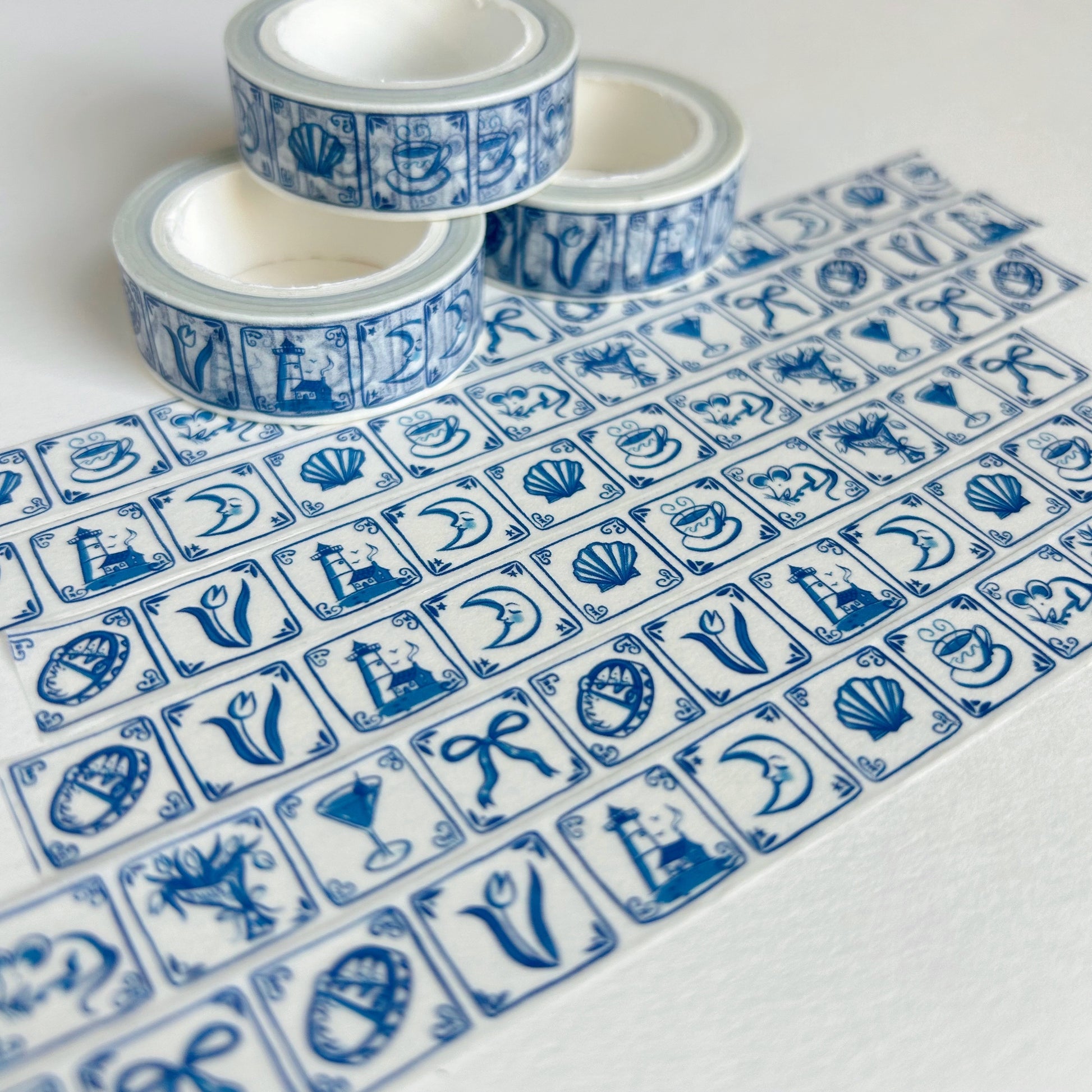 This perfect little roll of semi transparent washi tape, featuring ten repeating blue tiles illustrations. Use it to decorate wrapped gifts, scrapbook, or whatever you please!